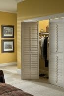 When considering purchasing shutters, don’t forget about your closet doors. The Eclipse Shutters Bi-Fold track system is commonly used for closet doors and allows the shutters to slide and fold to an open position. If a handle is desired, the Deluxe Divider Rail is the perfect solution for opening and closing shutters used on closet doors. This track system is designed to accommodate window and door openings from 24″ to 192″ wide and 20″ to 120″ high.